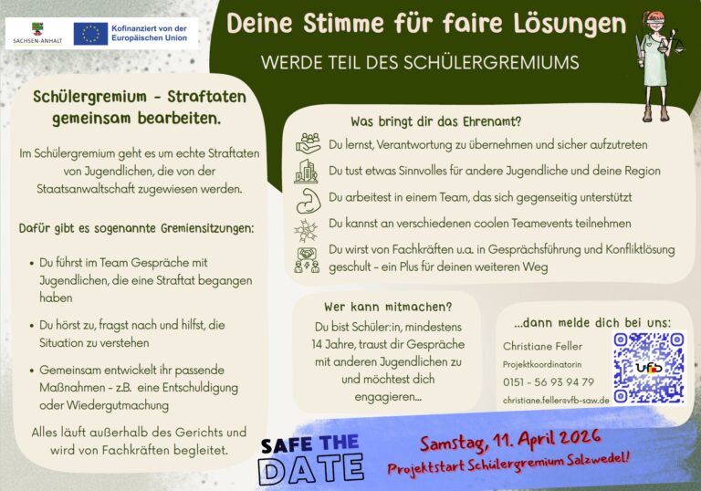 Das Projekt Schülergremium Salzwedel befindet sich in Trägerschaft des VFB Salzwedel e.V. Als Koordinatorin begleitet Frau Feller sowohl die straffälligen Jugendlichen und ihre Erziehungsberechtigten wie auch die Schülerrichter:innen und ist Ansprechperson für alle Partner:innen im Netzwerk.